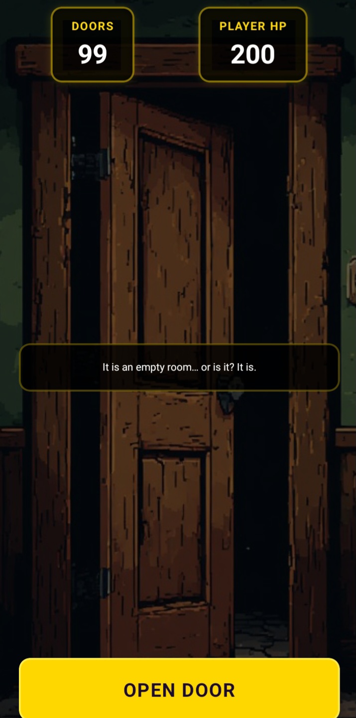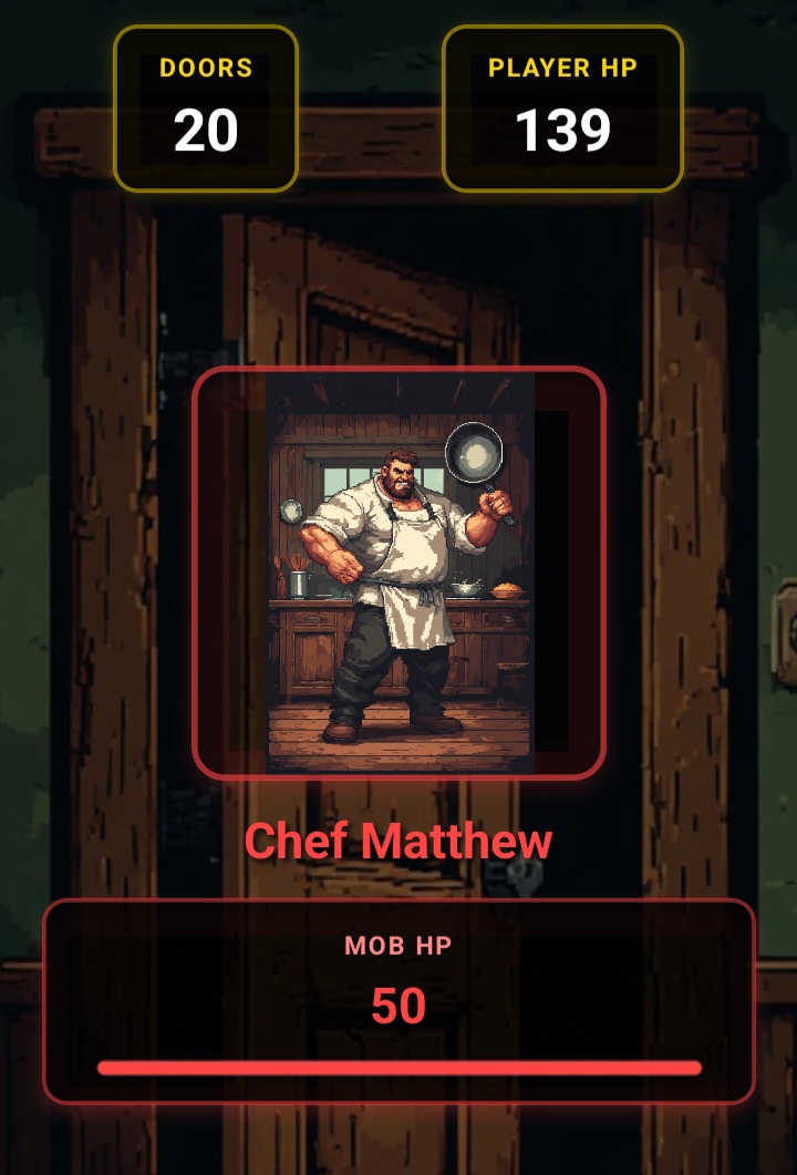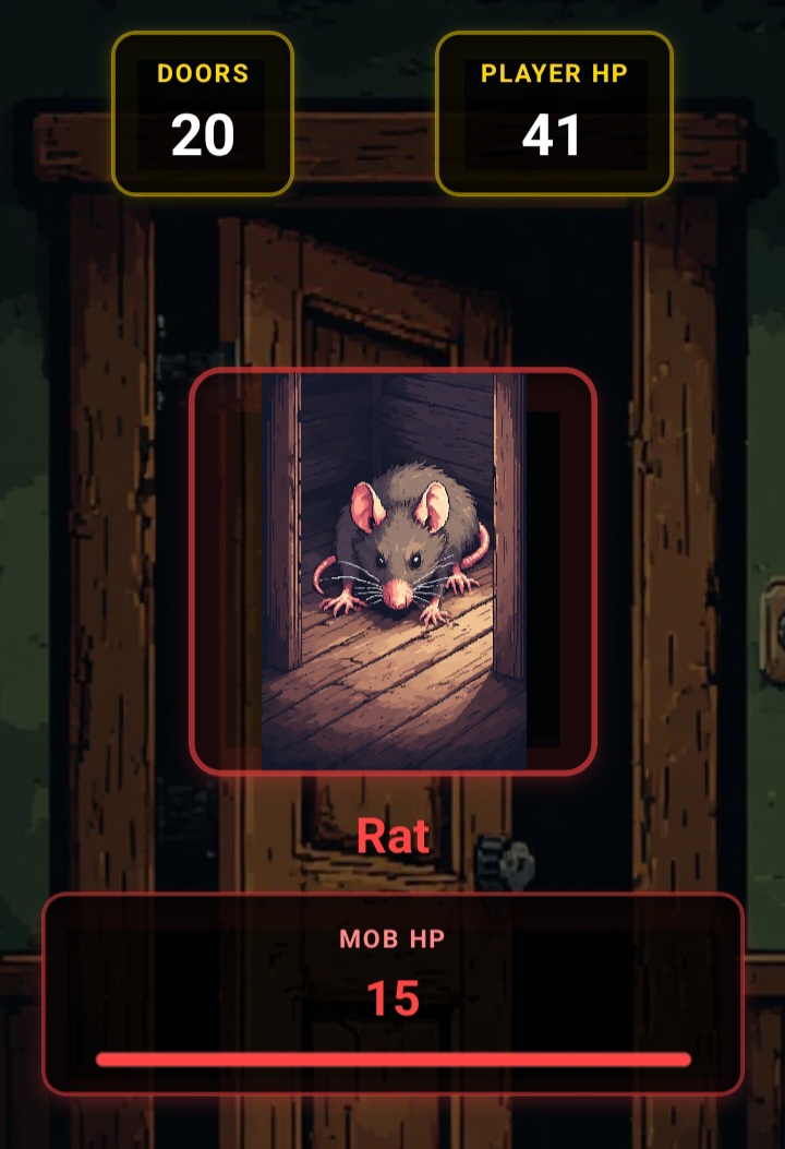 During a mob encounter, the player can choose to Run instead of attacking. The first Run attempt always succeeds and moves the player to the next door. Each time Run is used, the success chance decreases by 10% for future attempts. If a Run attempt fails, the mob immediately attacks and deals 50 DMG.